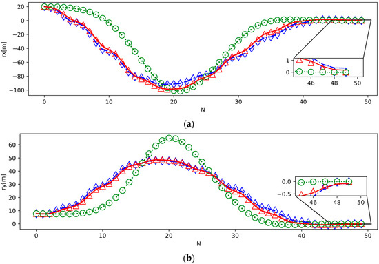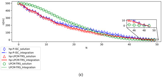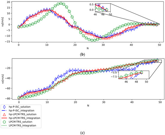 Figure 2 illustrates the changes in the position coordinates of the rocket in three-dimensional space. In each of the three subgraphs, the discrete points and continuous curves exhibit a good fit. When examining their respective terminal positions, it is evident that LPCM-TRS gradually approaches the target point several time points in advance, displaying a smoother trajectory. On the other hand, hp-LPCM-TRS and hp-P-iSC reach the target point with steeper changes in their trajectories.