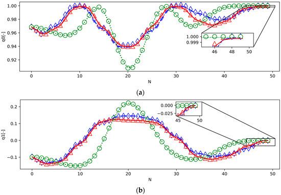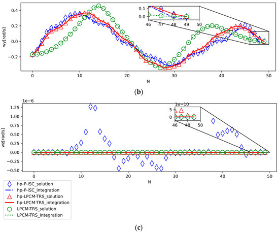 In Figure 3, the quaternion change curve for the rocket’s control attitude change is depicted. The discrete points and continuous curves of , , and exhibit a good fit. However, in the case of , there is a significant deviation in the middle part between the discrete points and the continuous curves for hp-P-iSC.