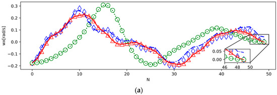 The figures depict the variation in the rocket’s angular velocity as it spins around its axis: (a) the angular velocity around the x-axis; (b) the angular velocity around the y-axis; (c) the angular velocity around the z-axis.