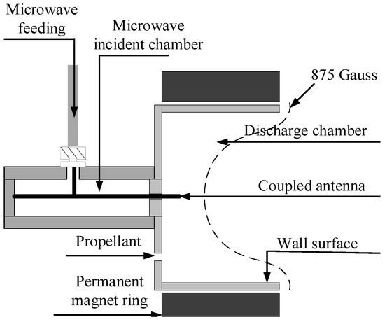 The structure of the transversal-feed ECRPT is shown in Figure 1, which is mainly composed of a magnetic circuit system, a microwave energy transmission system, a propellant supply system, a discharge chamber, an RF antenna, and a microwave incident chamber. The microwave transmission mode is TEM mode. In the chamber of the thruster, a magnetic mirror phenomenon occurs due to the role of the ring magnet, thereby forming a magnetic nozzle effect. The coupling antenna is connected to a microwave source via a coaxial wire and uses 2.45 GHz microwave energy to ionize the propellant. The microwave incident chamber is an important component of the transversal-feed ECRPT that is different from the traditional coaxial ECRPT. The microwave energy is transmitted to the coupling antenna via the coaxial antenna, which is transversal to the incidence chamber, and the microwave energy is transmitted to both ends of the antenna. The energy transmitted to the left end will be reflected using the metal barrier, and the reflected microwave will be transmitted to the right end. In the transmission process, two microwaves with the same frequency and the same phase will generate a microwave resonance phenomenon so that the energy transmitted to the discharge end of the antenna reaches the maximum value, thereby improving the efficiency of the microwave transmission system. The thruster structure mainly has two advantages: first, unlike the traditional electron cyclotron resonance ion thruster (ECRIT) [14], the grid structure is eliminated at the end of the thruster, and the plasma is accelerated via the magnetic field at the end of the permanent magnet, so that the electrons and ions are ejected at the same time, achieving the effect of self-neutralization. Secondly, it breaks through the traditional coaxial energy feeding method [15] and uses a structure that feeds microwave energy transversally to improve the energy transmission efficiency.