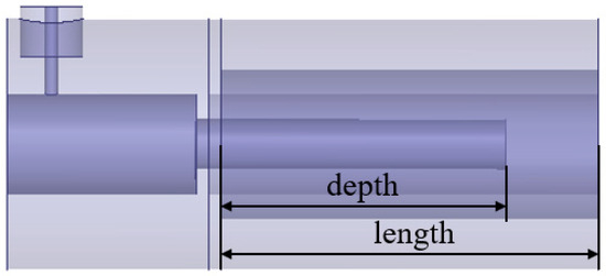The same method was used to simulate the coaxial-feed structure, and the influence of the two feeding structures on the electric field intensity distribution of the thruster was compared and analyzed. The simulation model is shown in Figure 4. The material settings are the same as the transversal-feed structure. The excitation source also uses wave port excitation. The relationship between the S-parameter and antenna length and the relationship between the S-parameter and antenna position were simulated, respectively.