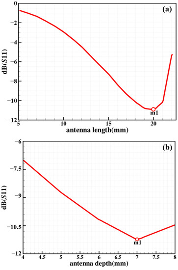 Figure 3 shows the relationship of transversal-feed structure between the S-parameters(S11) and antenna parameters. From Figure 3a, it can be seen that the S-parameters first decrease and then increase with the increase in the antenna length. The inflection point is near m1(20, −10.9247). According to the S-parameter characteristics, 20 mm is selected as the optimal parameter of the antenna length. It can be seen from Figure 3b that m1 is the inflection point of the relationship between the antenna depth and the S-parameter, and the optimal depth of the antenna is 7 mm.