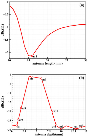 Figure 5 shows the relationship of coaxial structure between S-parameters and antenna parameters. It can be seen from Figure 5a that there is an inflection point at m1, but the minimum S11 parameter is not lower than −2.25 dB. It can be considered that different antenna lengths have little effect on energy transmission, and in order to compare with the transversal-feed structure, 20 mm is selected as the antenna length value, which is selected in the transversal-feed structure. From Figure 5b, it can be seen that the antenna depth can be selected after m2(9, −27.7843), and 10 mm is selected as the optimal depth during simulation.