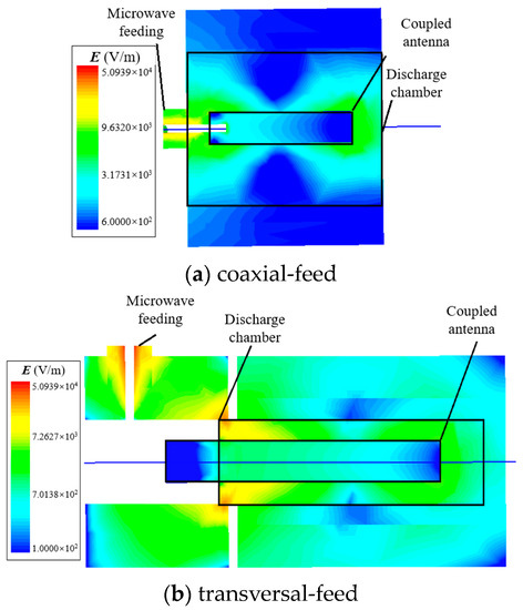 The antenna electric field intensity of coaxial-feed and transversal-feed structures are simulated, as shown in Figure 6. The microwave incident power is 10 W. Figure 6a is a coaxial-feed structure, and Figure 6b is a transversal-feed structure. It can be seen from the simulation results that the electric field intensity of the two feed structures can reach the order of 103–104 V/m in the discharge chamber region, which meets the energy requirements of the antenna for exciting the propellant. At the same time, the transversal-feed structure has a higher electric field intensity in the discharge region than the coaxial-feed structure, which indicates that the transversal-feed structure makes it easier to ionize the propellant according to Equation (4). This is due to the microwave resonance phenomenon in the transversal structure.