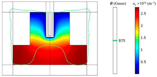 The thruster model is determined via the optimized design. The magnetic circuit system uses a samarium cobalt permanent magnet ring with an inner diameter of 3 cm, an outer diameter of 5 cm, and a height of 2.5 cm. The thruster discharge chamber has an inner diameter of 2.8 cm, an outer diameter of 3 cm, and a height of 2.5 cm. The operating conditions for this simulation are that incident power is 10 W, background pressure is 1 Pa, and propellant is argon. Figure 7 shows the distribution of electron number density in the designed transversal-feed discharge chamber, and the 875 Gauss magnetic induction contour is marked with a green line. Based on the principle of electron cyclotron resonance, under the microwave frequency of 2.45 GHz, the electrons will make a cyclotron motion around the 875 Gauss contour line, thereby greatly increasing the collision frequency with neutral gas and forming high-density plasma. It can be seen from the Figure 7 that the electron number density of the discharge chamber can reach the order of 1018 m−3. The higher ion number density benefits from the dual excitation effect of microwave resonance and electron cyclotron resonance achieved in the transversal feed.