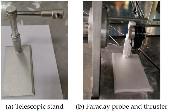 The retractable movable bracket was used to fix the Faraday probe, and the thruster is fixed on the non-magnetic stainless steel bracket. The height of the probe can be adjusted up and down according to the position of the plume region of the thruster, as shown in Figure 8. The voltage on the sampling resistor was measured using a RIGOL four-channel digital oscilloscope to calculate the ion current in the plume region.