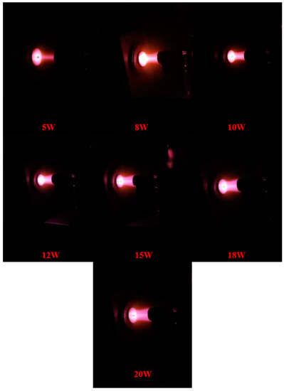 In this section, experimental studies of different microwave powers were carried out under the conditions of a pressure of 10−2 Pa and a mass flow rate of 0.5 SCCM. The ion current densities of the thruster plume region under microwave power conditions of 5 W, 8 W, 10 W, 12 W, 15 W, 18 W, and 20 W were analyzed and compared. Figure 9 shows the thruster discharge under different power conditions.