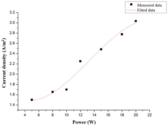 It can be seen from the collected data that the ion current in the plume region gradually increases with the increase in power. At a power of 20 W, the ion current density can reach 3 A/m2. In order to observe the changing trend of ion current in the plume region, a fitting curve of ion current density with power was fitted, as shown in Figure 10. It can be intuitively seen from the Figure that in the case of more than 10 W, the ion current density is higher, and the propellant is more fully ionized.