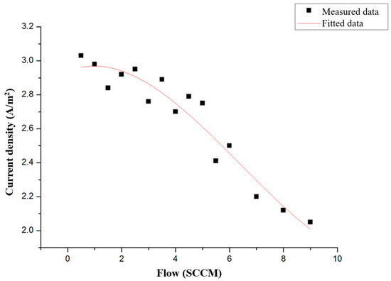 In order to explore how the working medium gas affects the discharge effect of the thruster, this paper has measured the ion current density of the plume area under different propellant gas flow rates from 0.5 SCCM to 9.0 SCCM using a Faraday probe. The fitting curve of ion current density with propellant gas flow is shown in Figure 11.