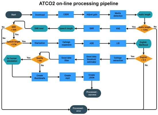 ATCO2 workflow for processing data collected by a community of feeders. Initially, the data are sent and stored on OSN servers. The audio data go through several modules to filter out recordings with a high level of noise and too-long or too-short segments. Blue rectangles are processes. The cyan arrow blocks are internal callback events, where the pipeline informs the master node about progress and sends intermediate results. The orange rhombuses are conditions, where intermediate results are taken into account (e.g., an SNR level), i.e., whether to continue (clean audio) or stop processing. A final internal callback is run when the pipeline finishes. It triggers the API to call the OSN server with the particular callback, for instance, the processing has finalized as OK or ERROR.