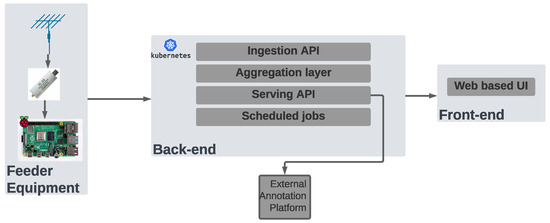 The high-level architecture is given in Figure 6. As one can observe, the platform has been divided into three distinct groups: (i) feeder equipment, (ii) back-end, and (iii) front-end. The architecture was decided during the design phase of ATCO2, with the main objective to achieve scalability of the entire system. That means keeping the complexity relatively low within all the groups, which allows it to