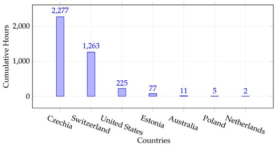 Length of recordings per country from the beginning of the service until 5 March 2023. Countries where the length of recordings is longer than 1 h are given. Note that some countries (e.g., United States) were not part of the official release of the ATCO2 corpora (see Table 2). Still, they are currently being collected in the OSN Platform.