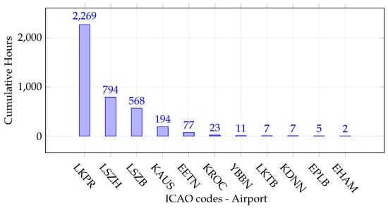 Length of recordings per airport from the beginning of the service until 5 March 2023. Airports where the length of recordings is longer than 1 h are given. LKPR: Vaclav Havel Airport Prague; LZSH: Zurich Airport; LSZB: Bern Airport; KAUS: Austin-Bergstrom International Airport; KROC: Frederick Douglass Greater Rochester International Airport; YBBN: Brisbane Airport; LKTB: Brno Airport; KDNN: Dalton Municipal Airport; EPLB: Lublin Airport; EHAM: Amsterdam Airport Schiphol.