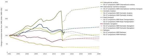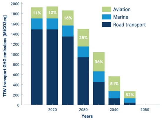 According to the latest report of the Intergovernmental Panel on climate change (IPCC), aviation contributes only about 2% to anthropogenic global greenhouse gas (GHG) emissions [1,2,3]. Depending on the fuels and technologies adopted, emissions from aircraft include carbon dioxide (CO2), nitrogen oxides (NOx), sulfur aerosols, compounds, particulates, and water vapor leading to the formation of contrails, which contribute to radiative forcing and global warming. Despite the small percentage of GHG emissions, the aviation sector is considered one that is difficult to abate and requires a revolution. Major industries, including the energy and automotive, are taking steps toward decarbonization, but aviation’s emissions continue to increase. Aircraft efficiency is improving, with fuel burn decreasing at approximately 1%/year. Looking at the net effect, Roland Berger experts [4] estimate that aviation may be producing as much as 24% of global CO2 emissions by 2050, compared to roughly 3% today. Even with hypothetical acceleration in improvements, considering the higher emission reduction potentials in other sectors, aviation may become the most important contributor to global GHG emissions. According to Figure 1 and Figure 2, in less than 10 years from now, pressure on ship operators and airlines would dramatically increase, since the relative contributions of these two transport modes will start to dominate the total GHG emissions of the transport sector in Europe.