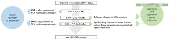 The paper starts with an in-depth assessment of nitrogen oxides emission prediction techniques, clearly stating the benefits and showstoppers of their exploitation for high-speed air-breathing engines using hydrogen. For the first time, a comprehensive review of emissions estimation techniques and their applicability beyond traditional subsonic aeroengines and fuels is reported (Section 2). Then, Section 3 provides the readers with useful insights on the case study: the air turbo-rocket engine configuration developed and optimized owing to a series of EC-funded projects on high-speed. Specifically, Section 3 reports the propulsive and emissive databases obtained at the end of the H2020 STRATOFLY project and currently exploited inside its follow-up, the H2020 MORE&LESS project. The data reported in this Section 3 represent a clear added value of the paper, providing important insights on the ATR and its performance in very different operating conditions, from takeoff up to cruise Mach numbers, covering a wide range of Mach numbers from 0.3 to 4. Section 4 describes the newly derived H2-P3T3 methodology in a step-by-step approach, starting from the original methodology and formulation to the definition of the new ones. Many innovative aspects can be highlighted in Section 4: