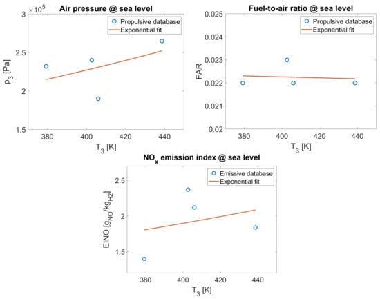 - The sea-level combustor inlet conditions in terms of pressure (), temperature (T3) and fuel-to-air ratio () corresponding to the four throttle settings prescribed in [9] are estimated or retrieved from the engine manufacturer’s proprietary information. Complementary NOx emission indexes at sea-level condition () are retrieved from the ICAO Aircraft Engine Emissions Databank. , , and are plotted against the T3 value corresponding to the four throttle settings.