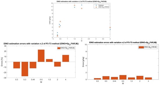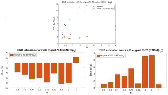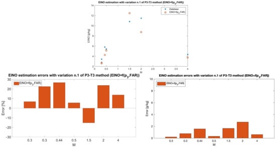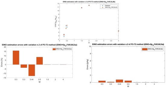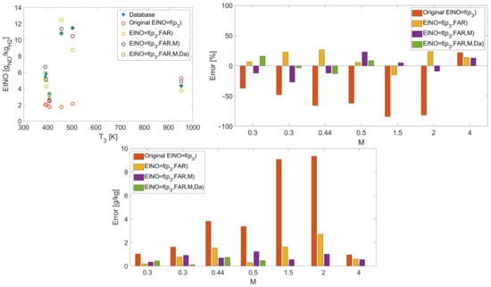 As expected, the evaluation is not accurate; therefore, the exponents of the original P3-T3 method are optimized as a first attempt to decrease the estimation error. A second modification consists in the addition of the Mach number, as independent variable, to make the function that estimates NOx emissions more representative. The Mach number is an immediate indicator of flight conditions and particularly significant in high-speed flight. Moreover, the Mach number is a known parameter in the conceptual design stage. As a final variation, the Damköhler number () is included. This variable is directly related to hydrogen/air combustion as it considers the matching between the residence time and the ignition delay times. The inclusion of this parameter is emblematic of the necessity to consider the effects of combustion to better represent the physical behavior of fuels that are alternative and different from kerosene.