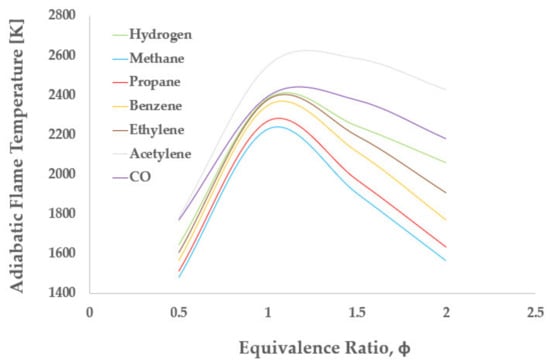 Adiabatic flame temperature correlation to equivalence ratio for different fuels.