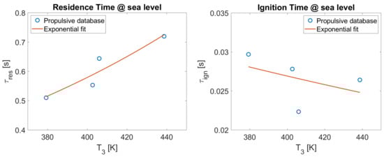 The final formulation reported in Equation (16) is obtained following the same approach as above. The improved propulsive database, which now contains the indication of both the ignition delay time and residence time, is used again to solve a nonlinear least-squares curve-fitting problem that reports the presence of the ratio inside the analytical formulation.