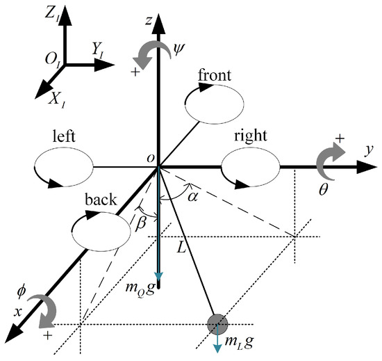 The positions of the quadrotor and the swing angle are coupled, so we use the Euler–Lagrange function to model the dynamics.