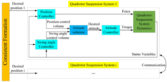 This paper designs a cooperative control method for the multi-quadrotor suspension system based on consistency theory and realizes the cooperative formation trajectory tracking control of the multi-quadrotor suspension system by designing a consistent formation cooperative algorithm of virtual piloting and a nonlinear controller. First, a new quadrotor suspension system model is established based on the traditional quadrotor model using the Newton–Euler method. This model can accurately reflect the influence of the load on the quadrotor while obtaining the swing of the load. Then, the vertical and horizontal positions are designed separately based on the quadrotor motion characteristics, and the formation algorithm based on the virtual pilot consistency theory ensures that the final convergence of each position is consistent. An integral backstepping controller and an integral backstepping sliding mode controller are designed for quadrotor position, attitude, and load swing control to achieve accurate and fast quadrotor trajectory tracking control while reducing load swing. The stability of all the controllers is demonstrated using Lyapunov functions. Finally, a multi-quadrotor suspension system formation cooperative simulation experiment is designed to verify the designed control method.
