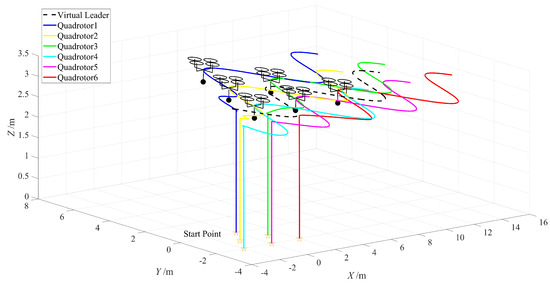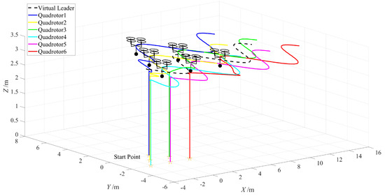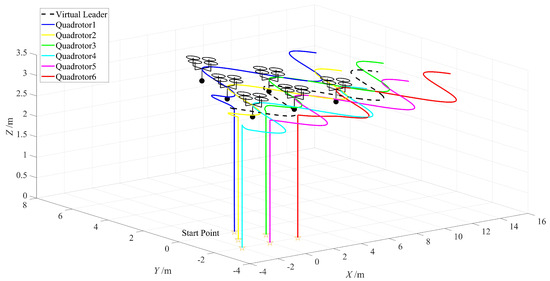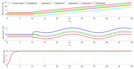 The expected trajectory of the quadrotor generated by the consensus formation algorithm shown in Figure 4. It can be observed from the figure that the designed formation algorithm can effectively complete the formation task under the guidance of the virtual leader, generating a formation trajectory that brings the quadrotors’ horizontal and vertical positions from the initial position to the expected formation trajectory. Additionally, the algorithm forms the corresponding formation according to the designed deviation matrix and maintains consistency among the quadrotors.