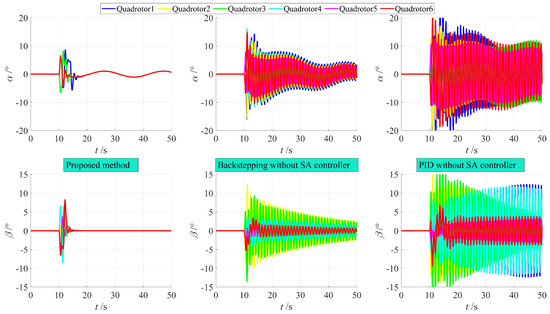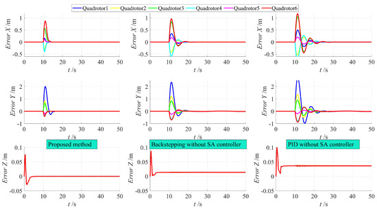 Figure 8 and Figure 9 illustrate the position errors of the quadrotors using the three control methods. It is clear that, when compared to the control without the swing angle controller, the method proposed in this paper achieves stability within 5 s, while the backstepping method takes 10 s, and PID control requires 15 s. Furthermore, the approach outlined in this paper exhibits a smaller overshoot. Once stability is reached, the positions of the quadrotors are influenced by load swinging due to the absence of a swing angle controller. As a result, periodic errors persist even after stability is achieved, and this issue remains unresolved with the backstepping method, while PID control induces more significant oscillations. However, the design presented in this paper significantly mitigates the impact of load swinging, preventing the repetitive oscillation of quadrotor positions.