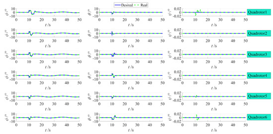 Figure 11 shows the control of the quadrotor’s attitude angles. It can be observed that the control method designed in this paper can accurately and quickly track the desired attitude angles.