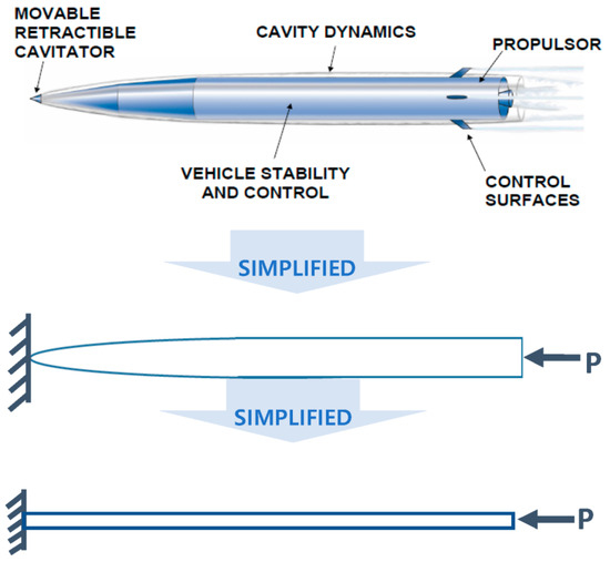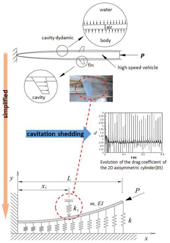 The mathematical model in Figure 2 shows that the underwater supercavity body is concentrated in drag by the cavitator at the bow, which can be simplified into a cantilever (Beck’s beam) with a fixed end [8]. The underwater high-speed vehicle has an external protruding structure, and this structure also acquires fluid characteristics due to a supercavity. At this time, water flowing into the external structure due to re-entrant affects the drag of the aircraft. This is due to the re-inflow of water into the cavity area, resulting in cavitation shedding. Due to cavitation shedding, the structure comes into contact with water instead of steam, causing it to vibrate significantly, as shown in the picture. As the structure (body) comes into contact with water, which has a higher pressure than water vapor, the drag increases; conversely, the more it comes into contact with water vapor, the drag decreases.