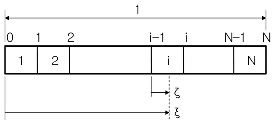 By substituting the local coordinates ζ = N ξ i + 1 ;   0 ξ 1 in Figure 3 into Equation (8), the following discretized equation is obtained.