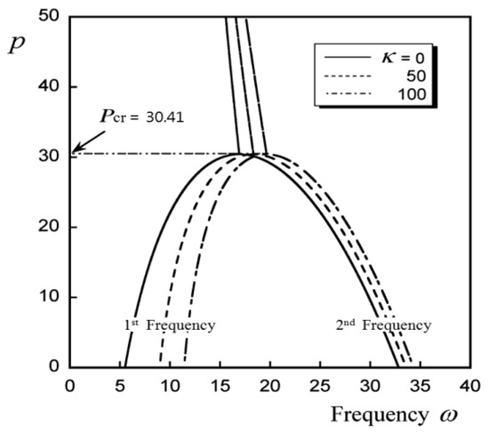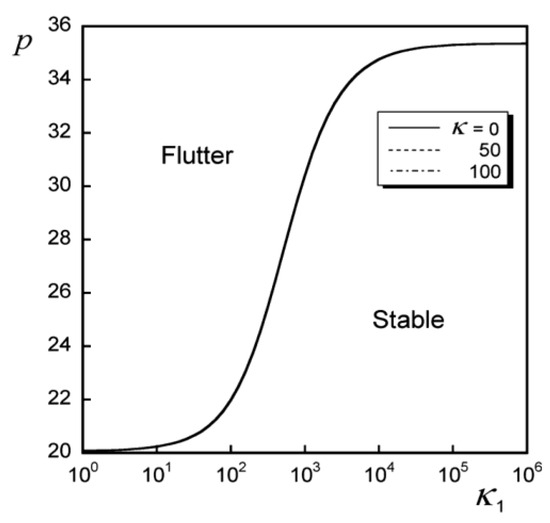 First, as shown in Figure 6, as the size of the concentrated mass, that is, κ1, increases, the instability characteristic transitions from flutter-type instability to divergence-type instability. Additionally, in the region of κ1 that is smaller than κ1cr), where the transition occurs, pcr is constant, regardless of κ, whereas in the region where κ1 > κcr, pcr changes depending on κ.