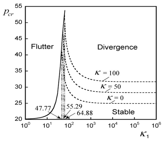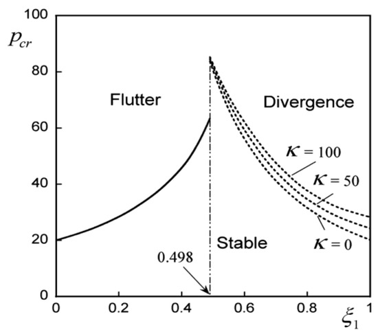 Second, as shown in Figure 8, when the internal damping of the beam is negligibly small, a transition from flutter-type instability to divergence-type instability occurs at ξ1 = 0.499. Additionally, in the section where flutter-type instability occurs, pcr is constant, regardless of κ, while in the section where divergence instability occurs, pcr also increases as κ increases.