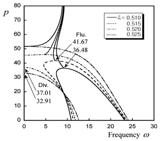 In Figure 7, in order to explain in more detail the process of transition from flutter-type instability to divergence-type instability, the position of the intermediate support point was calculated according to the change in the value of the following force when ξ 1 = 0.510, 0.515, 0.520, 0.525. It shows changes in the first and second natural frequency values. In the case of ξ 1 = 0.510, flutter-type instability, where the first and second natural frequencies match, occurs at pcr = 36.48, and in the case of ξ 1 = 0.515, flutter-type instability occurs at pcr = 41.67. The section where the first and second natural frequencies matched became shorter than when ξ 1 = 0.510, and the critical value at which flutter occurred increased. Divergence-type instability occurs at pcr = 37.01, where the first natural frequency of ξ 1 = 0.520 becomes 0, indicating that there has been a transition from flutter-type instability to divergence-type instability. In the case of ξ 1 = 0.525, divergence-type instability occurs at pcr = 32.91, where the first natural frequency becomes 0, and the critical value at which divergence occurs is reduced compared to the case of ξ 1 = 0.520.