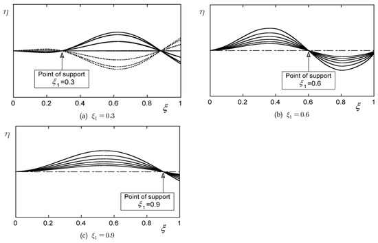 When there is an intermediate support at the position of ξ 1 = 0.9, as shown in Figure 9c, it has a divergence-type instability mode shape with upper and lower amplitudes based on the point of ξ 1 = 0.9. Therefore, in Figure 9, it can be seen that the unstable mode shape and the order of the mode are different depending on the location of the intermediate support point.