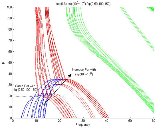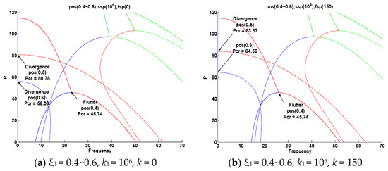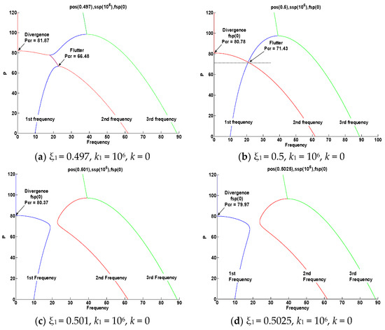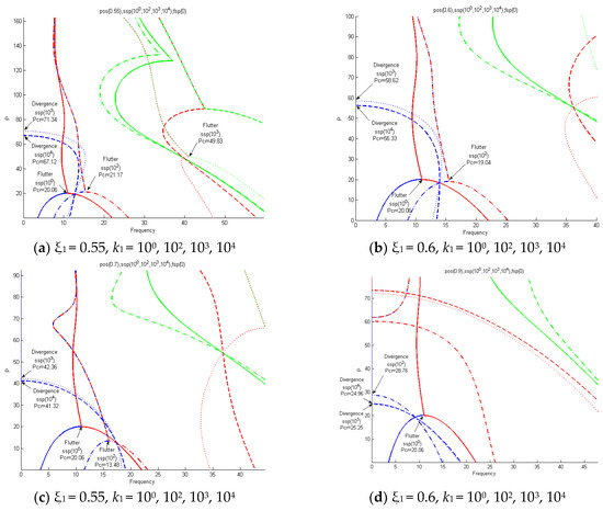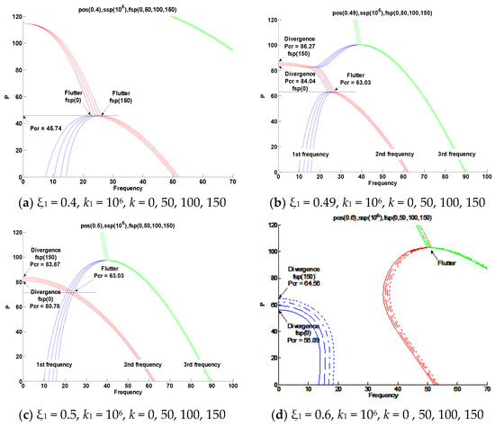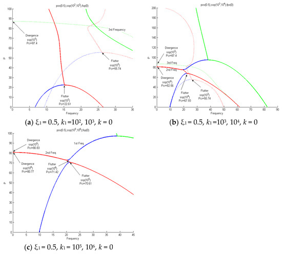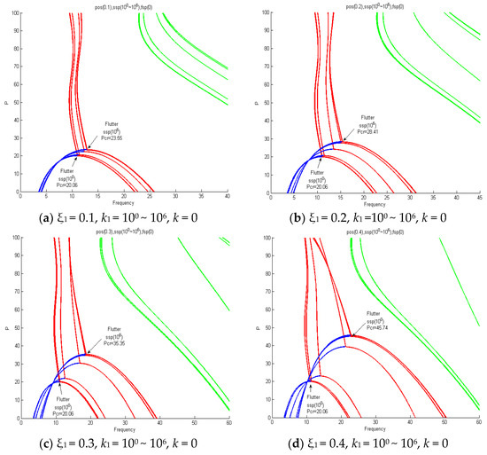 Figure 15 shows an analysis performed according to the elasticity value increase k1 = 102, 103, 104, 105, 106 (ssp) in the ξ1 = 0.5 (pos) section. Figure 15a applies the values of k1 = 102 and 103, and when k1 = 102 increases from k1 = 103, the critical value increases from pcr = 22.31 to pcr = 55.74 due to instability in the form of flutter. When k1 = 103, the first and second natural vibrations met and flutter instability occurred. Then, at pcr = 87.4, instability in the form of divergence appeared due to the third natural vibration. Figure 15b applies the values of k1 = 103 and 104, and when increasing from k1 = 103 to k1 = 104, the critical value increased from pcr = 55.74 to pcr = 67.93 due to instability in the form of flutter. When k1 = 104, the first and second natural vibrations met and flutter instability occurred. Then, at pcr = 82.56, instability in the form of divergence appeared due to the second natural vibration. In Figure 15b, k1 = 103 diverged by the third natural vibration, and k1 = 104 diverged by the second natural vibration. It was confirmed that when increasing from k1 = 103 to k1 = 104, the flutter critical value increased, but the divergence critical value after flutter decreased from pcr = 87.4 to pcr = 82.56. Figure 15c applies the values of k1 = 105 and 106, and when increasing from k1 = 105 to k1 = 106, the critical value increased from pcr = 70.61 to pcr = 71.42 due to instability in the form of flutter. When k1 = 105, 106, the first and second natural vibrations met and flutter instability occurred, and then instability in the form of divergence appeared due to the secondary natural vibrations at pcr = 80.83 and pcr = 80.77.
