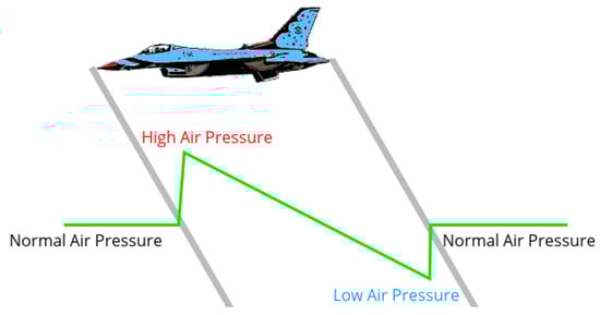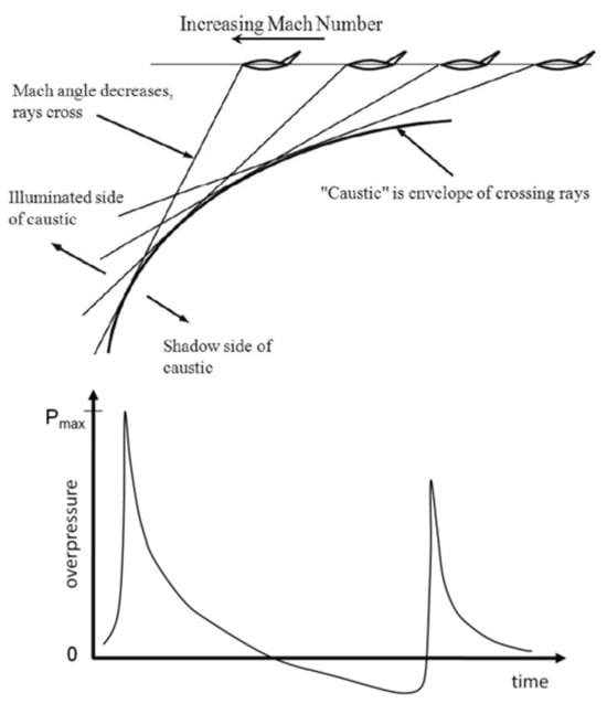 Since the Wrights brothers’ first flight took place in 1903, flying faster has been a human dream, and as research and technology developed, especially with the introduction of jet engines, this dream started to come true. In October 1947, General Charles ‘Chuck’ Yeager piloted the Bell X-1 [1] to a speed of Mach 1.07, breaking the barrier of sound for the first time and ushering in the era of manned supersonic flight. During the years after this important event, a multitude of supersonic aircraft were manufactured exclusively for military purposes. However, in 1968, the world’s first commercial supersonic transport aircraft, the Soviet Tupolev Tu-144, took its first flight, just two months before the inaugural flight of the British–French Concorde. Tupolev Tu-144 was in passenger service in 1977 and 1978 but only on one route, completing just 55 flights. It was a commercial failure with numerous technical faults leading to reliability and safety concerns, culminating in a test flight crash in May 1978. It continued to fly until 1999 as a test vehicle. Concorde was operated from 1976 to 2003, and since that date, no other supersonic transport aircraft has flown. The main reasons for Concorde’s limited commercial success were the high fuel consumption linked to the high thrust needed, high operational costs and the impact of the sonic boom produced on the environment and communities. In 1978, an FAA regulation restricted the operation of civil aircraft at speeds greater than Mach 1 overland. This severely limited the routes viable for Concorde and discouraged the interest in developing new supersonic civil aircraft for a long period of time. This fact if, on one hand, blocked the market for supersonic aircraft, on the other hand raised great interest in the sonic boom phenomenon, and considerable investigation and research, aiming at understanding the phenomenon and predicting it, were undertaken over the following decades. NASA describes the sonic boom as “thunder-like noise a person on the ground hears when an aircraft […] flies overhead faster than the speed of sound” [2]. Sonic boom results from the coalescence of the shock waves generated by an aircraft flying supersonicly trough their propagation into the atmosphere to the ground. Here, a strong and impulsive pressure change is generated that may damage structures and annoy, in a not acceptable way, people. According to Coulouvrat [3], it seems that the sonic booms generating at cruise altitudes are not harmful in terms of intensity, but high adverse reactions might be expected from people likely to be frequently exposed to even low-level booms. It can have a negative impact also on marine and wildlife [4]. The typical sonic boom signature at the ground is the so-called “N-wave” (Figure 1), which is characterized by sharp pressure jumps at the front and back of the waveform, with a slow pressure drop in between. Sonic boom intensity and its extension on the ground depend mainly on aircraft weight, size, altitude and Mach number. The area affected by a sonic boom is called the ‘boom carpet’ and can extend up to 70 miles behind the aircraft [5].