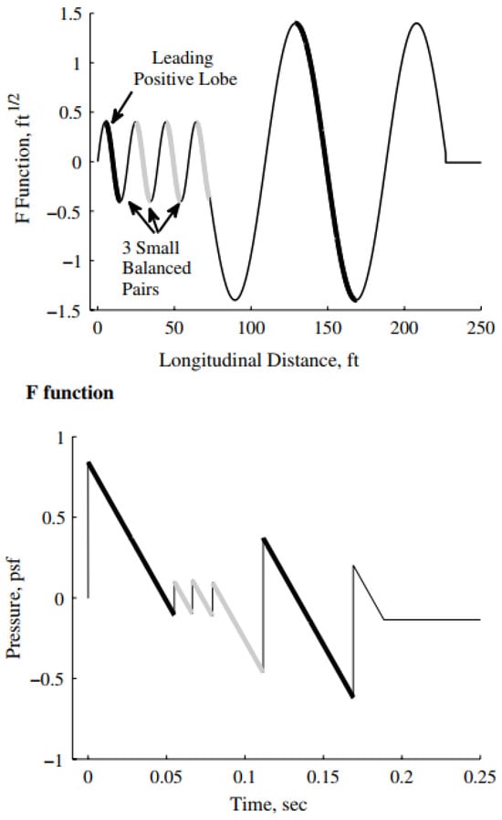The SGD sonic boom minimization process produces cross-sectional area profiles that generate either a minimum overpressure “flat-top” signature (Figure 7b) or a maximum-rise-time boom, which has a small initial shock pressure rise (ISPR) followed by a gradual increase to the peak overpressure (Figure 7c). These sonic boom types are essentially modified N-waves. Another option to reduce the annoyance of the sonic boom to humans is to generate a multishock signature (Figure 7d) by means of a lobe-balancing method [116,117]. Lobes are created using lift, by trimming lifting surfaces to obtain a frozen, shock balanced F-function, like the one showed in Figure 8, at different flight conditions.