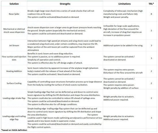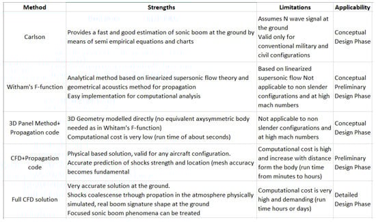 Several factors, such as variation in signature shape, pressure levels, rise time and frequency content, seem to have a large influence on the resultant sonic booms disturbance level [7]. These are, in turn, affected by environmental conditions, making sonic boom a real complex phenomenon to be analyzed and modeled. In the last 20 years, the encouraging results of the previous studies and research, along with the developments in the aviation industry and the introduction of increasingly advanced technologies, have led many companies to strongly invest in the design and development of the new generation of supersonic aircraft. At the same time, the ICAO (International Civil Aviation Organization) Committee on Aviation Environmental Protection is working to develop new certification standards for supersonic aircraft and environmental regulations in terms of sonic boom, noise and emissions [8]. The FAA is gathering data and information from sonic boom flight test campaigns to determine whether to amend the current ban on supersonic flight by civil aircraft overland in the United States [9]. Sonic boom reduction and mitigation constitutes supersonic flight’s biggest challenge. However, the reintroduction of supersonic aircraft needs also to address high efficiency and low climate impact, and must be economically and commercially viable. Although some conventional aircraft designs have proven that they can be carefully shaped and optimized in order to obtain lower levels of both sonic boom and wave drag, it seems to be insufficient to attain sufficient noise reduction. In addition, other stringent requirements on LTO noise, high-altitude NOx emissions and fuel consumption would be difficult to meet. A technological breakthrough is needed for the design of a new generation of supersonic transport aircraft. In order to achieve this, it seems necessary to explore a multitude of different and unconventional aircraft configurations, together with careful airframe–engine integrated design. Provisions should be made, as necessary, for appropriate noise reduction systems and measures, and the evaluation of their impact at the aircraft level is of vital importance. A multi-disciplinary optimization (MDO) approach is needed, and sonic boom prediction and minimization must be in the loop within the very first steps of the process. In this regard, a review of existing sonic boom prediction methods and mitigation techniques and systems is due.