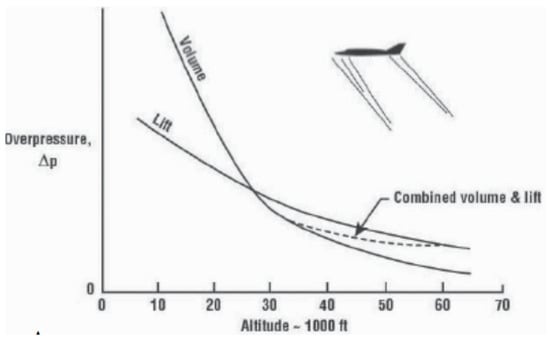 Altitude effect on overpressure due to both lift and volume (Source: [124]).