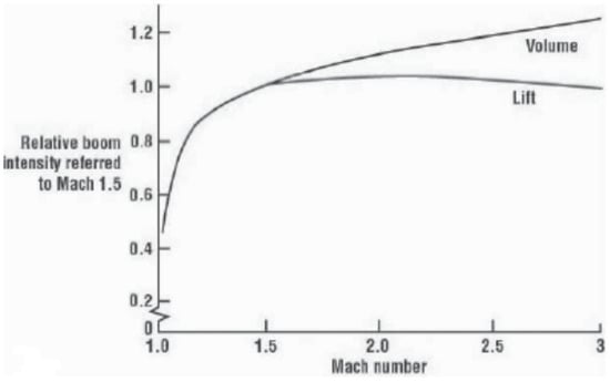 George and Seebass [108,109] developed a relatively complete theory, in which they found the lower bounds for the bow and the tail shock of a midfield signature. It laid the theoretical foundation for the sonic boom minimization method. However, the nose shape determined by the minimized area distribution was as blunt as in the previous theories, with the consequence of a significant drag penalty. The low boom–high drag paradox is shown in a scheme in Figure 6. In addition, this method sacrificed the front fuselage size, resulting even in the reduction in usable fuselage space. Darden, in 1979 [110], advanced the George and Seebass’ method by controlling the bluntness of the area distribution near the nose, overcoming the drag rise problems associated with the previous theory.