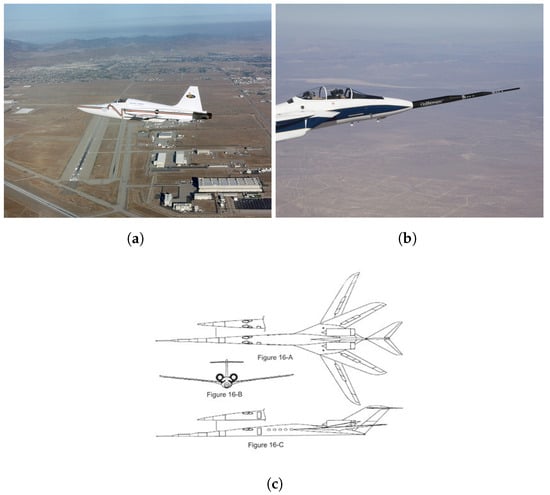 NASA F5-E (a) (Source: [134]), NASA F15 equipped with Gulfstream Nose Spike (b) (Source: [138]) and NASA-Gulfstream X-54 experimental aircraft concept drawing (c) (Source: [139]).