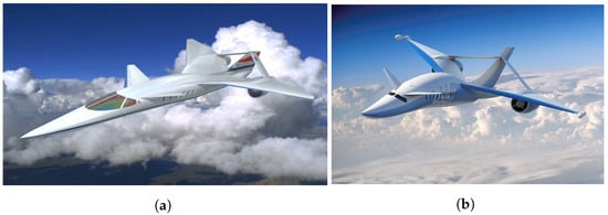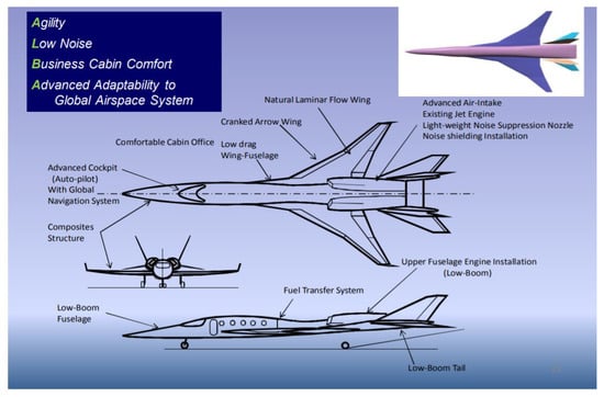The JAXA D-SEND (Drop test for Simplified Evaluation of Non-symmetrically Distributed sonic boom) project (2010–2015) ran flight experiments to demonstrate the possibility of a “low-sonic boom design concept” and to acquire measurement methods for aerial sonic booms, contributing to the ongoing deliberation of international standards for sonic booms of next-generation supersonic aircraft. The project comprised two phases: through D-SEND#1, JAXA established, for the first time, a new method of demonstrating the low sonic boom design concept and sonic boom measurement system in the form of a balloon drop test, while during D-SEND#2, an experimental supersonic glider model called the “Silent SuperSonic Concept Model (S3CM, S-cube Concept Model)”, designed to reduce sonic booms originating from the front and rear, was flown at supersonic speed. They also ran evaluation tests using sonic boom simulators to assess how humans sense them and how buildings are affected [140]. In the end, JAXA cooperated with the SKY Aerospace Institute on a SSBJ design (Figure 14) [141]. The main features are the cranked arrow wing that uses natural laminar flow technology and a non-symmetrical fuselage to mitigate sonic booms. All these technological achievements come from these several projects JAXA has been involved in for years.