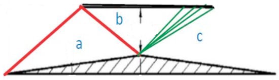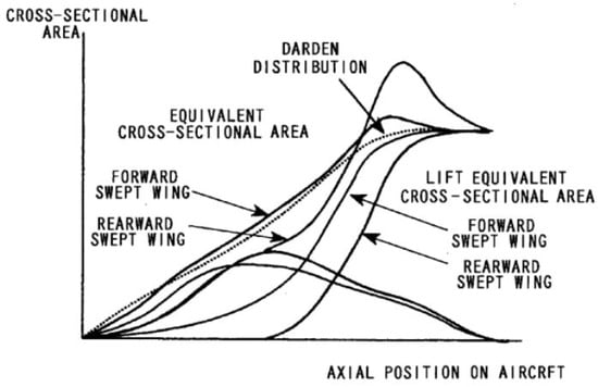 In 1955, Lomax [19] generalized the modified linear theory for arbitrary lifting configurations, showing that the axisymmetric body area rule can be generalized to asymmetric bodies, including the effects of lift, and Walkden, in 1958, applied these findings to sonic boom prediction [20]. The cross-sectional area distribution in the F-function (Equation (2)) was substituted by an equivalent area distribution (which is a function of the azimuthal angle, or angle in the roll direction) comprising both volume and lift contribution (Equation (1)):