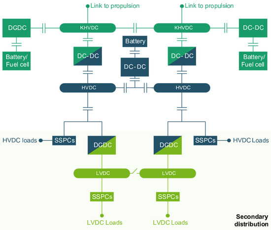 HECATE will define the electrical architecture and all the related technologies. Several architectures will be evaluated, and one electrical architecture will be developed and tested. In HECATE, the distribution is grouped into three main parts depending on voltage levels: KHVDC (Very High Voltage Direct Current) dedicated to main propulsive loads and distribution and considering voltage levels around 800 V; HVDC (High Voltage Direct Current) dedicated to high power non-propulsive loads tentatively at 540 V; and LVDC (Low Voltage Direct Current) dedicated to conventional electrical loads at 28 V (Figure 1). The conceptual differences between other electrical distribution system architectures and the HECATE architecture are that the entire aircraft electrical system is supported through the primary KHVDC bus, which provides power to the propulsion and to the secondary distribution HVDC network through a DC–DC converter. This approach yields the best performance metrics out of all cases studied, and it is the needed revolution for full- or hybrid-electrical architectures in which a battery, fuel cell, or combination of both may be the alternative or main source of power.
