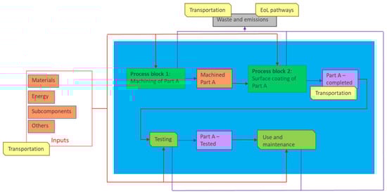 A data questionnaire will be developed to gather the information needed to perform the Life Cycle Inventory (LCI) [37], including details on the processes that constitute the system, a Product System Diagram, and their material and energy inputs and outputs (Figure 4). Data collection may be classified into two types: highly specific and accurate primary data and secondary data, which is commonly less specific and highly aggregated. Primary data are defined by the European Commission as “directly measured or collected data representative of activities at a specific facility or set of facilities” [37,38]. Secondary data are defined as “data that is not directly collected, measured, or estimated but rather sourced from a third-party life-cycle inventory database” [37,38]. When no primary data is available, assumptions are made based on literature research and experts judgements from HECATE partners.