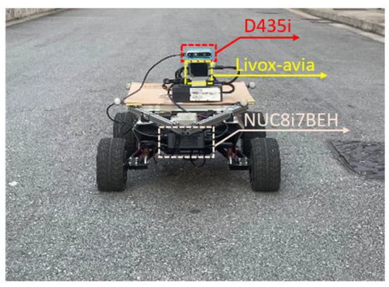 To better demonstrate the effect of the proposed method, a UAV (F330, manual assembly), and a UGV (Scount-mini, produced by AgileX Robotics, Shenzhen, China) will be used for the experiment as shown in Figure 1. The UAV is the object being tracked with no tracking devices other than the equipment itself to maintain flight. In the indoor experiment, a VICON motion capture system was used to locate the UAV and the UGV. The position output for the UAV can be used as the ground truth for the tracking results, and for the UGV, it can provide position feedback for the controllers of the UGV for navigation. The UGV component of the system is responsible for tracking and following the UAV in real time using a combination of the RGB-D camera (D435i, produced by Intel RealSense, US), the 3D LiDAR (Livox-avia, produced by DJI, Shenzhen, China), and an onboard computer (NUC8i7BEH, produced by Intel, US), as depicted in Figure 2. The RGB-D camera captures color and depth information of the surrounding environment, while the 3D lidar provides accurate distance measurements. In the outdoor scene, we apply a LiDAR-inertial odometry (LIO) on the UGV to provide position information for its navigation and path planning.