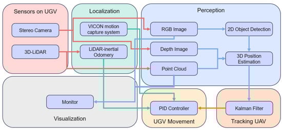 The software architecture of the UAV tracking system consists of four main modules: localization, perception, object tracking, and vehicle control. Figure 4 provides an illustration of the software architecture, highlighting the interactions between different modules.