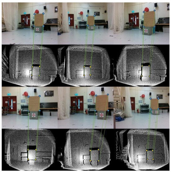 The planar board data from the RGB camera and the LiDAR camera for calibration from different angles and distances. The RGB image above and the point cloud image below were collected by the RGB camera and LiDAR at the same time and correspond one to one. Four corresponding corner pairs within the two images are manually extracted.