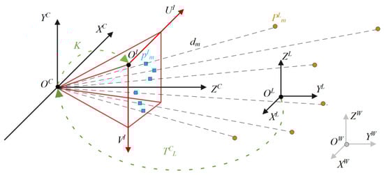 The PnP problem can be simply summarized as follows: Given a set of n 3D points in a reference frame and their corresponding 2D image projections and calibrated camera intrinsic parameters, the 6 degrees-of-freedom (DOF) pose of the camera relative to the reference frame in the form of rotation and translation can be determined. As shown in Figure 6, there are four coordinate systems belonging to the camera, the imaging plane of the camera, the LiDAR, and the real world, in which the coordinates are distinguished by the superscripts C (camera), I (image plane), L (LiDAR) and W (real world), respectively. For instance, is the pixel coordinate corresponding to a point in the real world on the camera imaging plane, while is the corresponding 3D coordinate in the LiDAR frame.