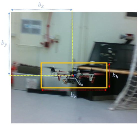 Suppose we have the optimal state () at time and its corresponding covariance matrix (). By applying Equations (18) and (19), the prediction of the state () at and its corresponding covariance matrix () can be obtained. Then, the Kalman gain () is computed by using Equation (20). The optimal state () at time can be acquired in Equation (21) with and . Finally, Equation (22) corrects the corresponding covariance matrix () of the state at time for the calculation of next time step (). Through this iterative process, the 3D position in camera frame of the UAV can be tracked all the time, even if the sensor fails in a short period of time.